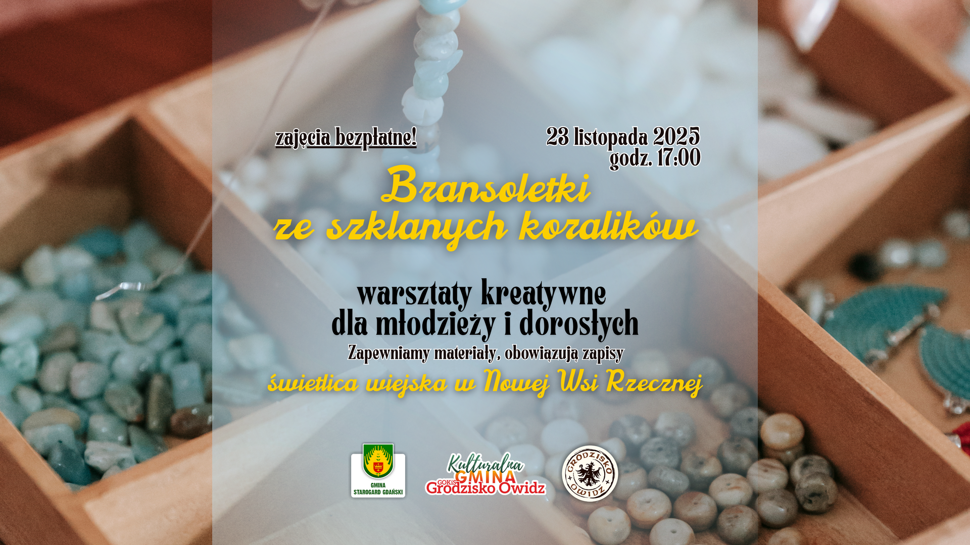 23 października 2025 r. o godz. 17:00 spotkamy się, aby wspólnie stworzyć bransoletki ze szklanych koralików, wzbogacone o piękne makramowe sploty. To doskonała okazja, aby nauczyć się nowych technik rękodzielniczych, spędzić twórczo czas i wyjść z zajęć z własnoręcznie wykonaną, unikatową biżuterią.